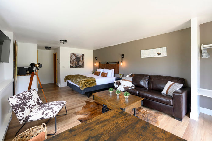 Our rooms have a chic mountain-modern style and each is uniquely designed. The upper lodge rooms provide ground level access with a meadow view from your private balcony where the lower rooms are accessed via the lower patio. There is immediate access to The River Trail and Memory Park from the Lodge.